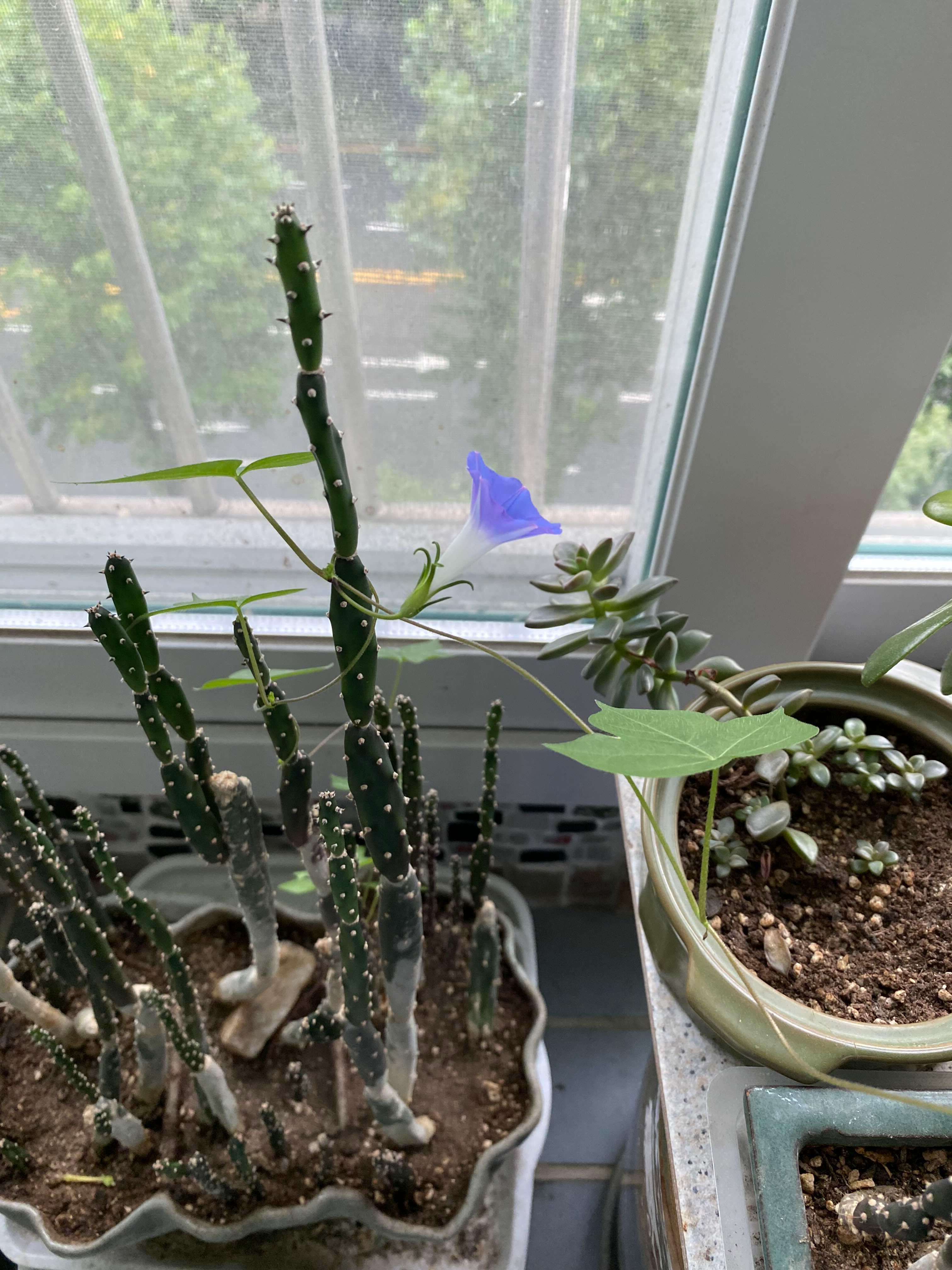 선인장 화분에서 자라려다 보니 환경이 나빠서인지 꽃은 한 송이.